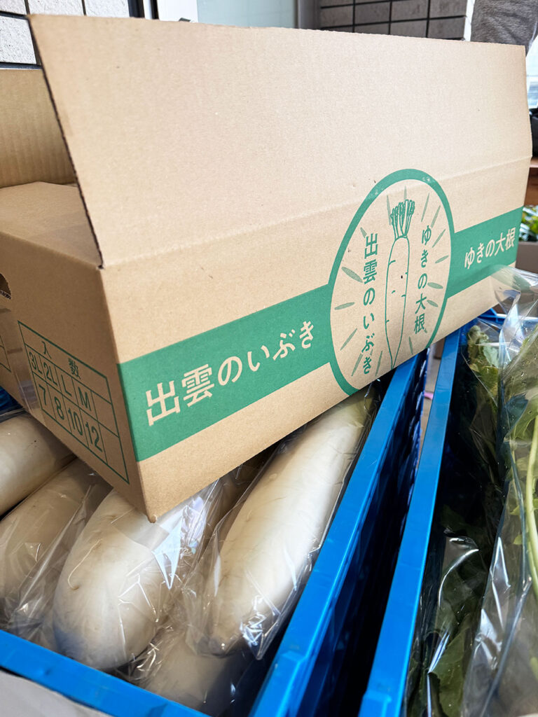 島根県出雲市で大根、ネギ、トマト、キュウリ等々、野菜を栽培している「おかずくらぶ」様のブランド大根「出雲のいぶき ゆきの大根」を市場に出荷するための出荷用ダンボールをデザインいたしました。